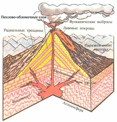 Первичный магматический очаг вулкана расположен на глубине 60-100 километров в слое, который получил название астеносферный. Именно здесь расположены корни вулкана. На глубине 20-30 километров в земной коре расположен вторичный магматический очаг. Именно он является тем, что питает вулкан через жерло. Кстати, верх вулкана – конус, сложен именно из продуктов его извержения. Кратер, который располагается на вершине – это чашевидное углубление, которое в отдельных случаях заполняется водой. Диаметры у кратеров могут быть различные – так, например, у Ключевой сопки кратер составляет 675 метров, а у не менее известного вулкана Везувия, который виновен в гибели Помпеи, кратер составляет 568 метров.